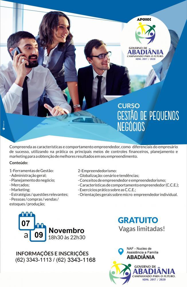 O Sebrae traz a Abadiânia, com o apoio do Prefeito Zé Diniz, durante os dias 07, 08 e 09 de novembro, das 18h30 às 22h30, o Curso Gestão de Pequenos Negócios, onde será ministrado como administrar sua empresa para ter sucesso.