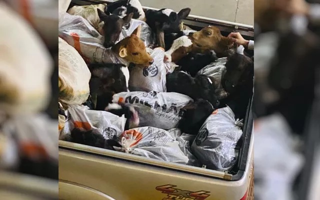 O caso foi denunciado por uma pessoa que estava em um posto de gasolina. As novilhas estavam em cima uma das outras e amarradas dentro de sacos de ração para gado. Os animais foram resgatados e levados para uma ONG
