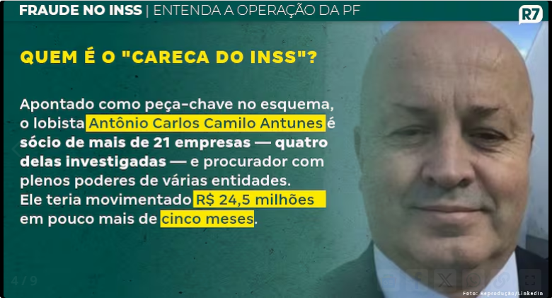 Além deles, A Polícia Federal também investiga o empresário Antônio Carlos Antunes, conhecido como o “careca do INSS”. De acordo com relatório da corporação, ele era intermediário financeiro das entidades associativas.