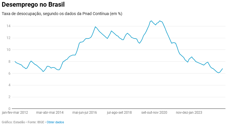 A taxa de desocupação no Brasil ficou em 6,8% no trimestre encerrado em fevereiro, de acordo com os dados da Pesquisa Nacional por Amostra de Domicílios Contínua (Pnad Contínua) divulgados nesta sexta-feira, 28, pelo Instituto Brasileiro de Geografia e Estatística (IBGE).