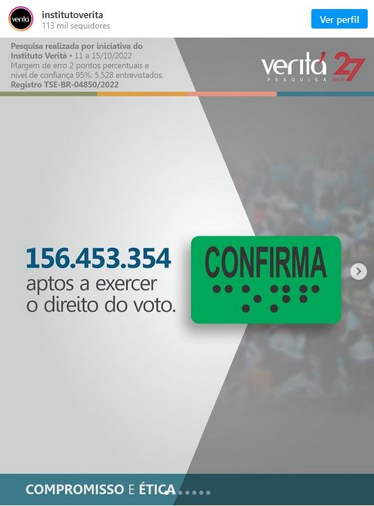 O levantamento do Instituto Veritá, realizado por iniciativa própria, divulgado neste domingo (16/10) mostra o presidente Jair Bolsonaro (PL) com 51,2% dos votos válidos. Luiz Inácio Lula da Silva (PT) aparece com apenas 48,8% das intenções de votos válidos na disputa do segundo turno da eleição.