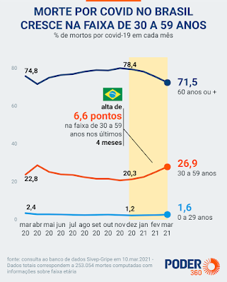 O aumento das mortes no grupo de meia-idade é acompanhado por uma redução do percentual de idosos. As vítimas que tinham 60 anos ou mais foram 79% do total em novembro, a maior proporção até agora. Desde então a proporção cai de forma constante. Em março, 71,5% das pessoas que morreram por covid-19 estava nessa faixa etária.