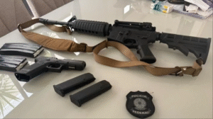- Em Goiás, os agentes da PF apreenderam um fuzil e uma pistola.