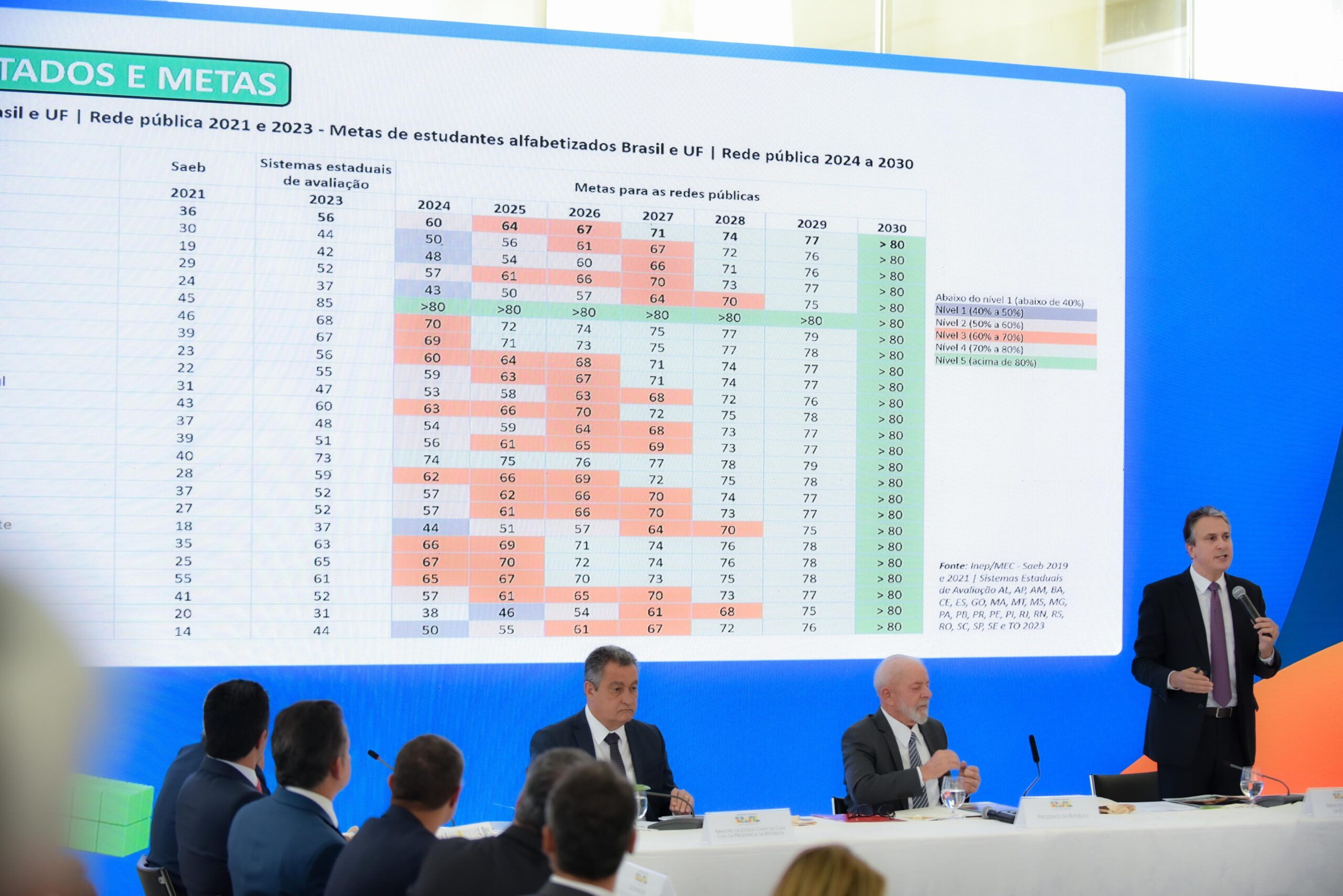 A meta para a rede pública é que todos os estados tenham níveis de alfabetização superiores a 80% até 2030. No caso de Goiás, o objetivo é crescer dois pontos percentuais a cada ano. “A gente vai acompanhar todos os municípios e todos os estados. Temos informação e vamos acompanhar, não pra ficar fazendo concorrência entre quem fez e quem fez menos, mas para orientar e discutir junto como é que a gente melhora o que não está bem. E também como é que a gente divulga o que vai bem, para que outros possam seguir os mesmos passos”, finalizou o presidente Lula.