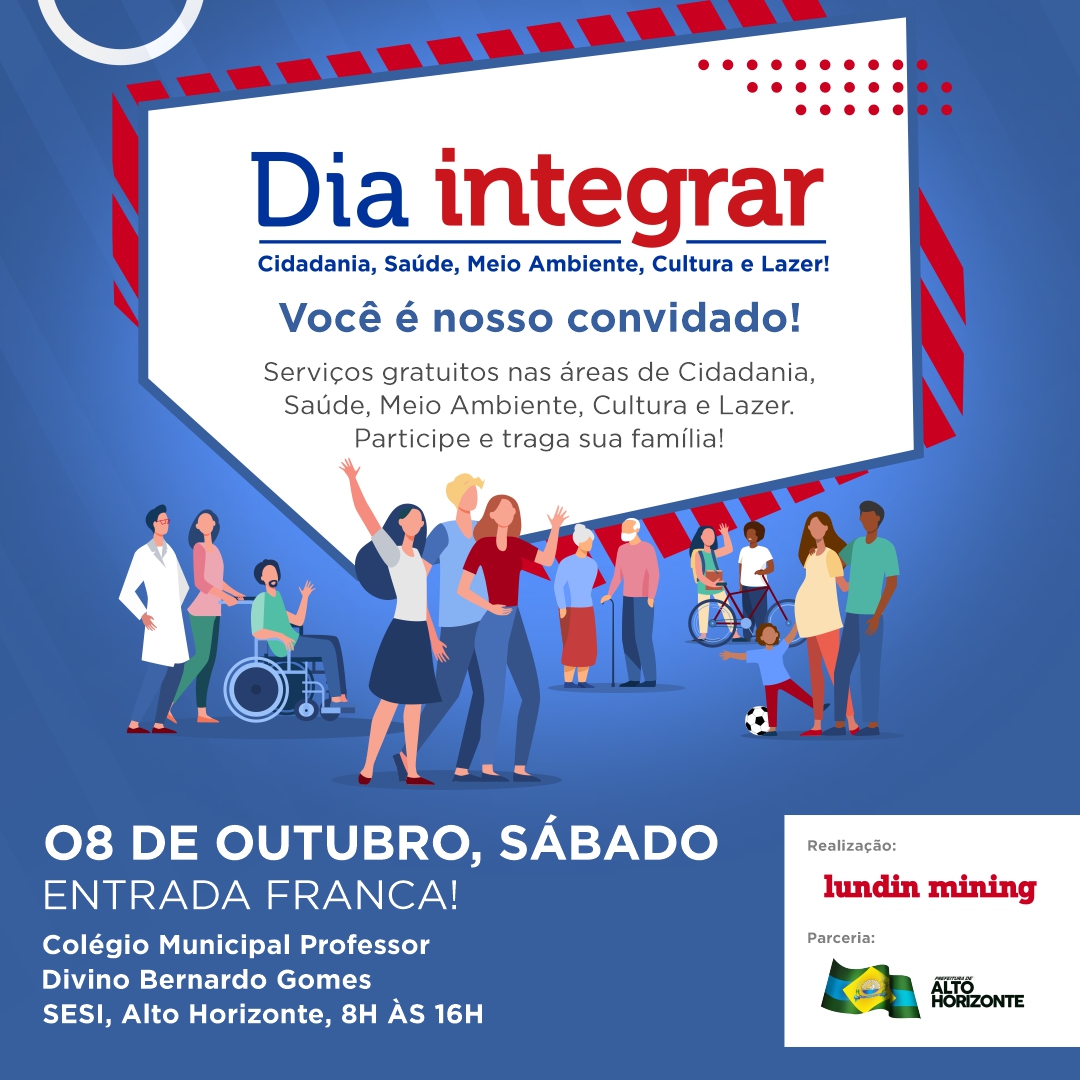 A Lundin Mining realiza a 13° edição do Dia Integrar, no dia 08 de outubro, das 8h às 16h, no Colégio Municipal Professor Divino Bernardo Gomes. A ação é resultado de uma parceria com a Prefeitura de Alto Horizonte, entre outras instituições. O evento traz uma programação completa de serviços que beneficiarão a população local e das cidades vizinhas.