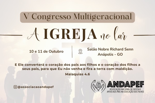 Com o tema “A Igreja no Lar”, o 5º Congresso Multigeracional da Associação Nacional de Defesa e Apoio aos Pais na Educação dos Filhos (ANDAPEF) será realizado nos dias 10 e 11 de outubro, no Salão Nobre Richard Edward Senn, na Universidade Evangélica de Goiás (UniEVANGÉLICA). O evento promete reunir famílias inteiras em um espaço de adoração, aprendizado e comunhão entre gerações.