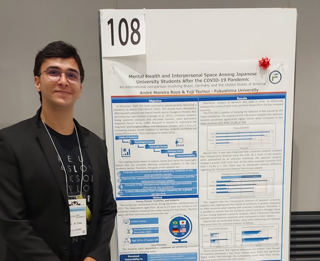 Com o tema “Saúde mental de estudantes universitários no período pós-pandemia”, a pesquisa de André investiga os impactos emocionais e psicológicos vivenciados por jovens universitários no Japão. Em suas palavras: “no dia 6 de setembro de 2024 participei da 88ª Conferência Nacional da Associação Japonesa de Psicologia. Nesse evento, tive a oportunidade de expor os resultados preliminares da minha pesquisa de mestrado.”
