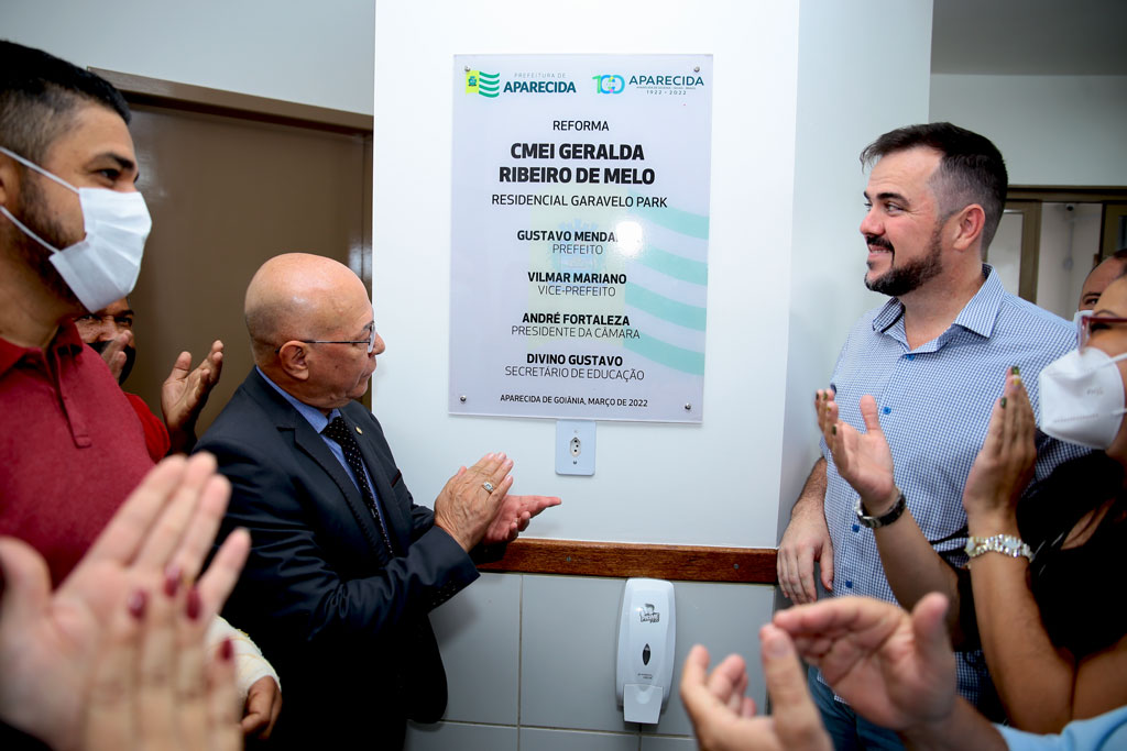 Nesta terça-feira, 15, a Prefeitura de Aparecida de Goiânia entregou os serviços de reforma do CMEI Geralda Ribeiro de Melo. Localizada no Setor Residencial Garavelo Park, a unidade atende 164 crianças matriculadas na Educação Infantil nas etapas de creche e pré-escola. A solenidade de entrega aconteceu no período da manhã e contou com a presença de servidores da instituição, membros da comunidade escolar e de autoridades políticas dos poderes Executivo e Legislativo, com destaque para a participação do prefeito Gustavo Mendanha.