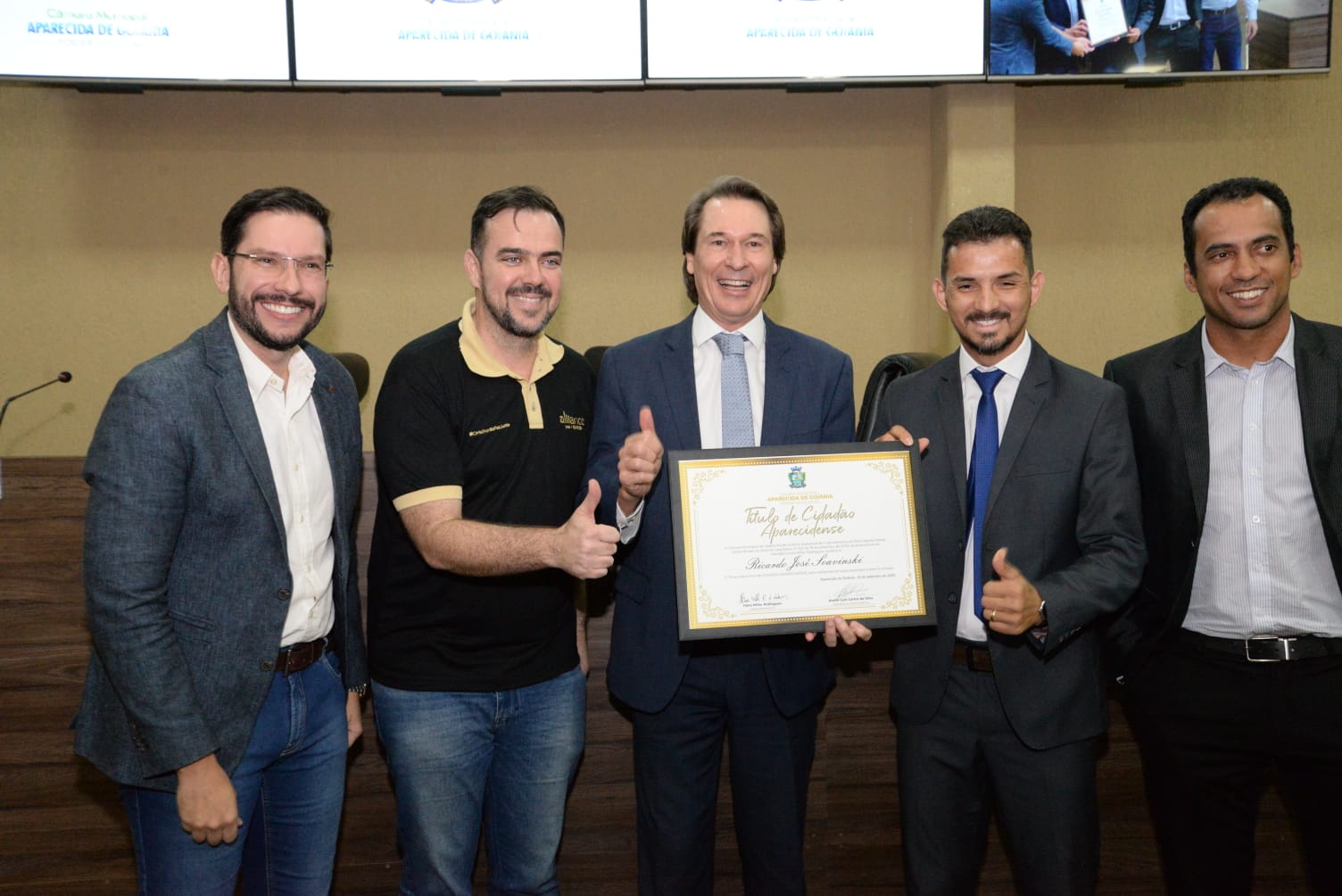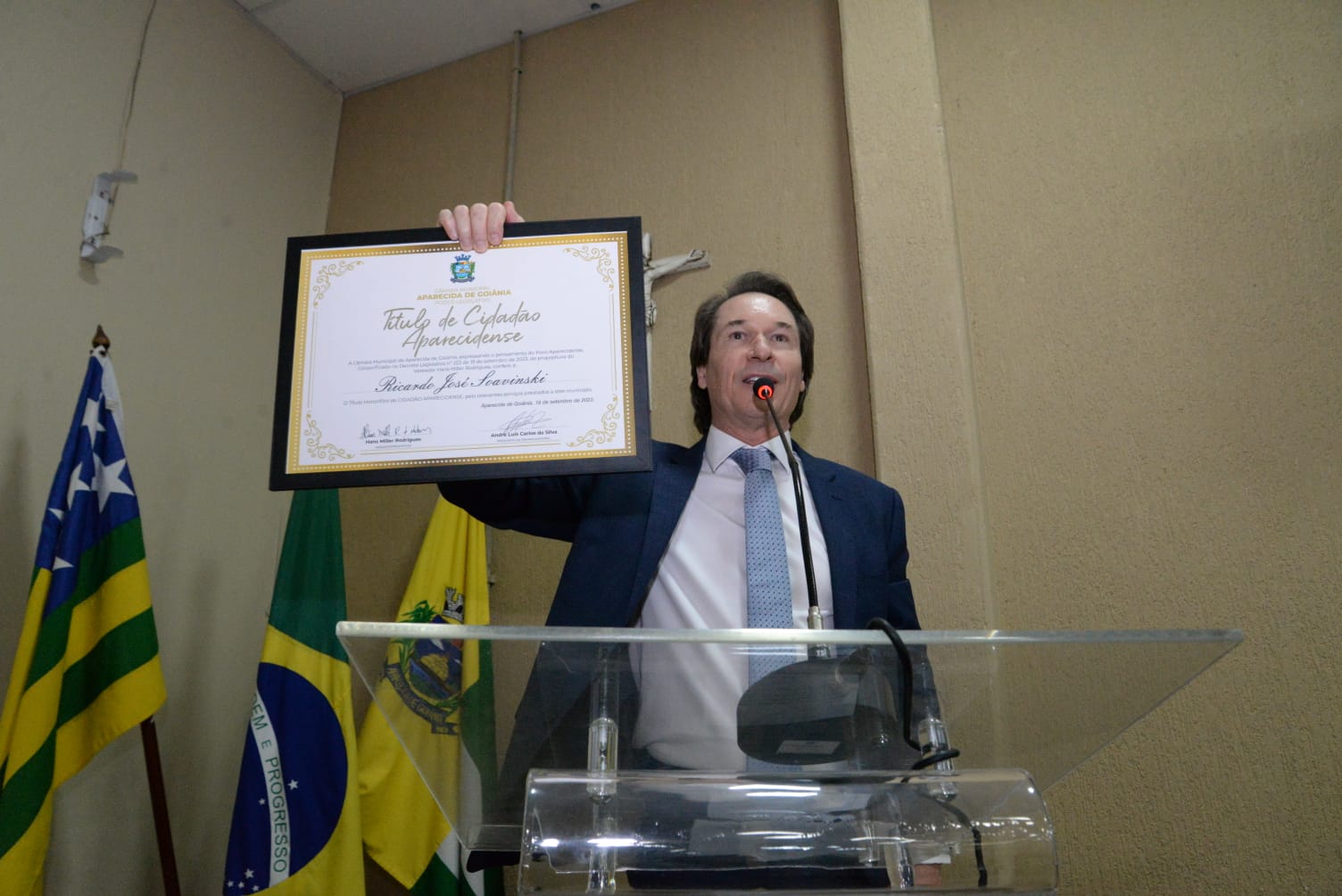 Ainda durante a solenidade, o vereador Hans Miller também entregou título de cidadão aparecidense ao Presidente Ricardo Soavinski.