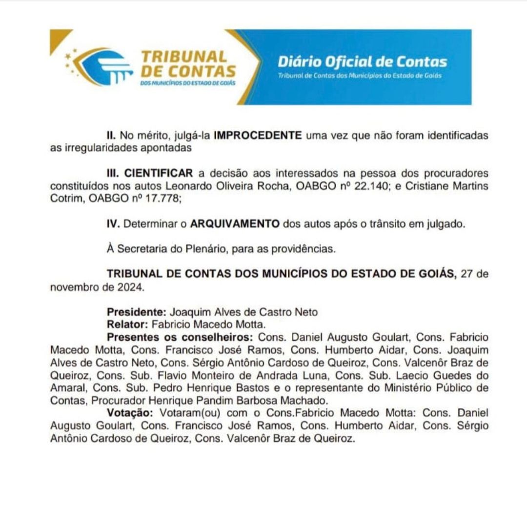 A decisão do acordão foi publicada no Diário Oficial de Contas do TCM – GO nesta quinta-feira, 05, onde ficou determinado também, o arquivamento dos autos, após o transito em julgado.