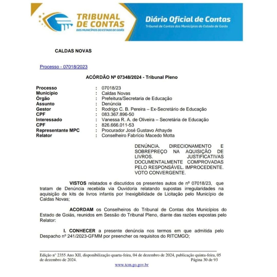 O Tribunal de Contas dos Municípios do Estado de Goiás julgou IMPROCEDENTE a denúncia contra o ex-secretário Municipal de Educação, Rodrigo Brum e a atual secretária Municipal de Educação, Vanessa de Oliveira, acusados de terem cometido irregularidades na aquisição de kits de livros infantis (Turma do Cabeça Oca) por inexigibilidade de licitação pelo Município de Caldas Novas.