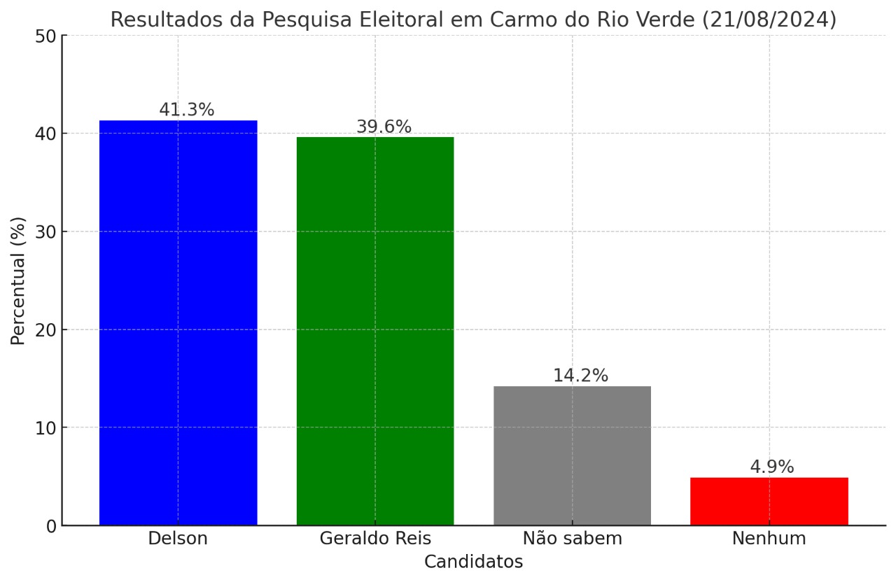 A pesquisa, registrada sob o número GO-00191/2024 e realizada no dia 21 de agosto de 2024, envolveu 450 eleitores e possui uma margem de erro de 4,48 pontos percentuais para mais ou para menos, com um nível de confiança de 95%. Esses números refletem uma tendência de mudança na preferência dos eleitores de Carmo do Rio Verde.