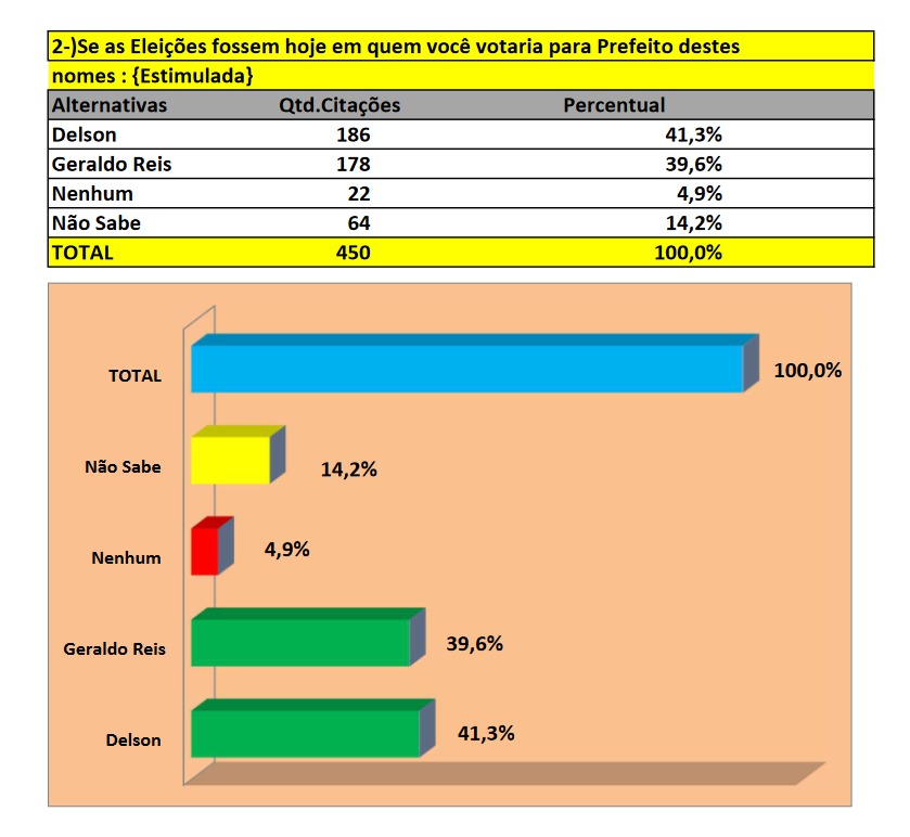 De acordo com os dados divulgados, Delson lidera com 41,3% das intenções de voto, enquanto Geraldo Reis registra 39,6%. A diferença de 1,7 ponto percentual marca uma mudança inédita nesta eleição, sugerindo que Delson pode estar ganhando força junto ao eleitorado local.