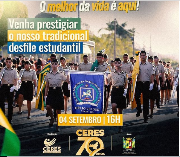 Tradicional atração do aniversário de Ceres e que sempre conta com grande participação da comunidade. O Desfile Cívico Estudantil uma das principais atrações da festa vai acontecer no dia 04 de setembro, data em que o município completa 70 anos de emancipação política.