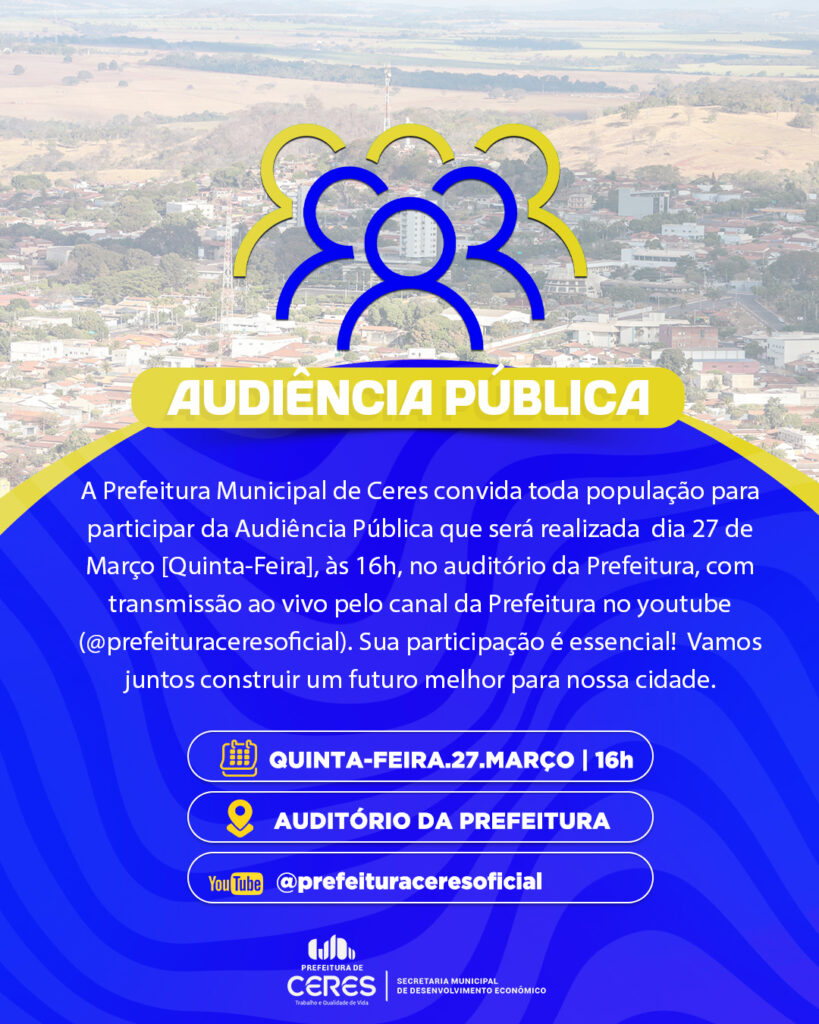 A Prefeitura Municipal de Ceres convida toda a comunidade para participar da Audiência Pública que discutirá o Plano Plurianual (PPA), a Lei de Diretrizes Orçamentárias (LDO) e a Lei Orçamentária Anual (LOA), na próxima quinta-feira, dia 27 de março, às 16h, no auditório da Prefeitura.