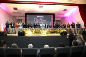 Mesa de autoridades durante entrega do Diploma Mulher Ceresina. Fotos: Divulgação/Câmara Municipal de Ceres
