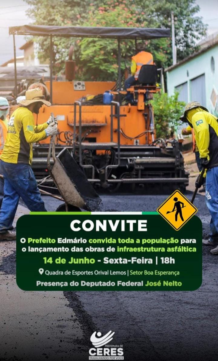 A Prefeitura municipal de Ceres na pessoa do prefeito Edmario Barbosa convida toda a população ceresina, para o grandioso lançamento de obras asfálticas no município.