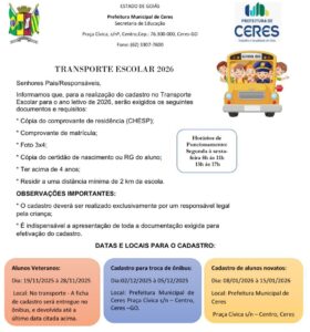 A Prefeitura Municipal de Ceres, vem, através da Secretaria Municipal de Educação, convocar os pais e responsáveis por alunos da rede municipal de Educação, para fazerem o cadastro do Transporte Escolar de 2026.