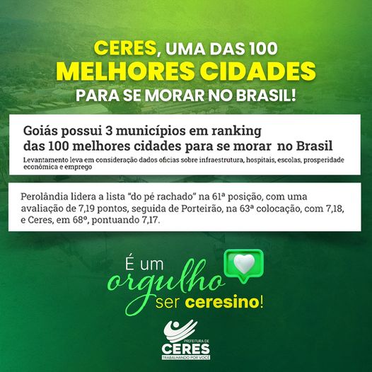 É com muita alegria que compartilhamos essa notícia incrível: Ceres está entre as 100 melhores cidades para se morar no Brasil!