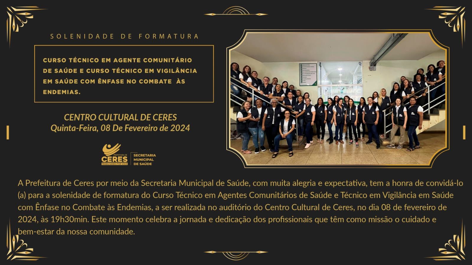 A Prefeitura de Ceres por meio da Secretaria Municipal de Saúde, com muita alegria e expectativa, tem a honra de convidá-lo (a) para a solenidade de formatura do Curso Técnico em Agente Comunitário de Saúde e Técnico em Vigilância em Saúde com Ênfase no Combate às Endemias, a ser realizada no auditório do Centro Cultural de Ceres, no dia 08 de fevereiro de 2024, às 19h30min.