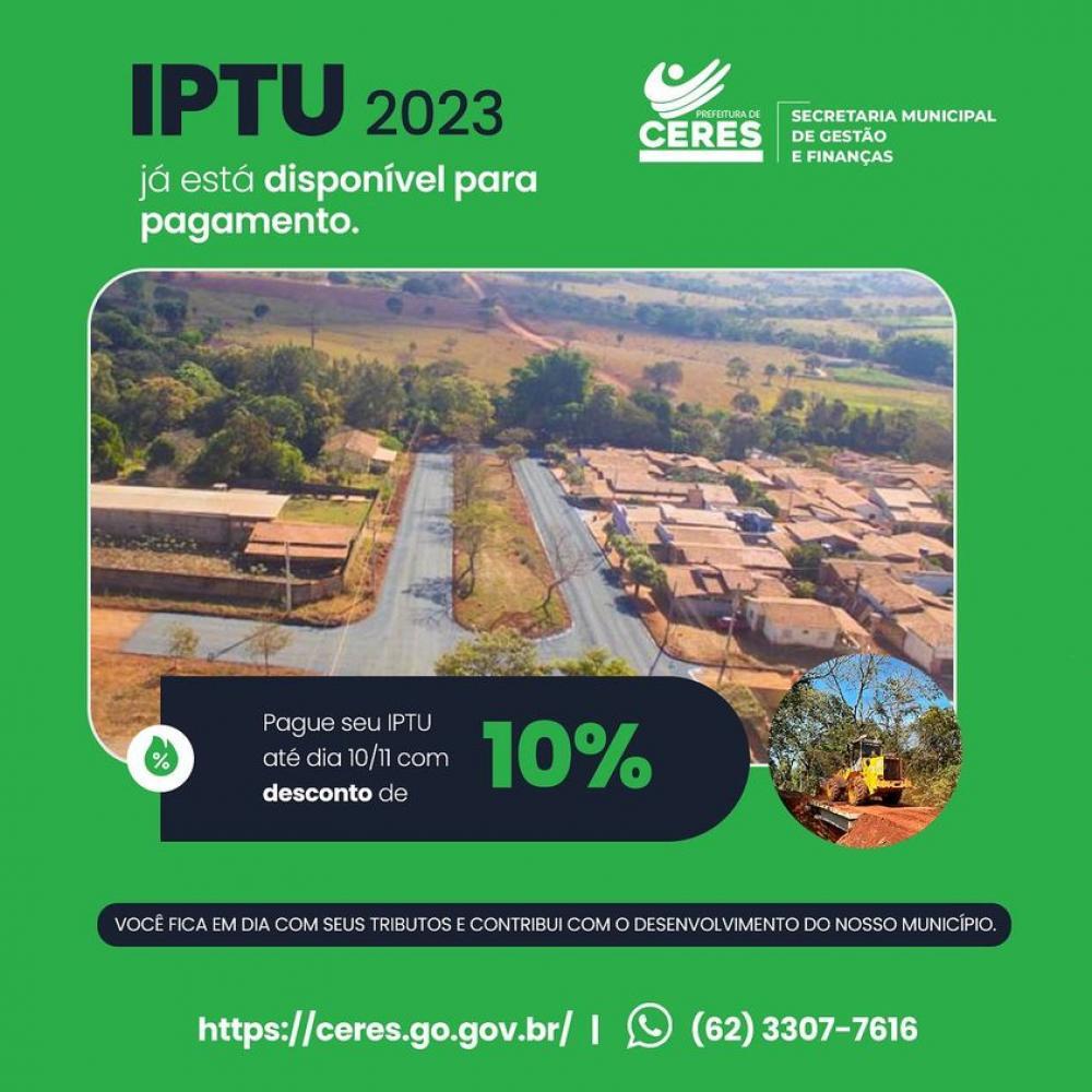 “Pague seu IPTU até dia 10 de Novembro e ganhe 10% de desconto! Ficar em dia com seus tributos é contribuir para o progresso do nosso município.