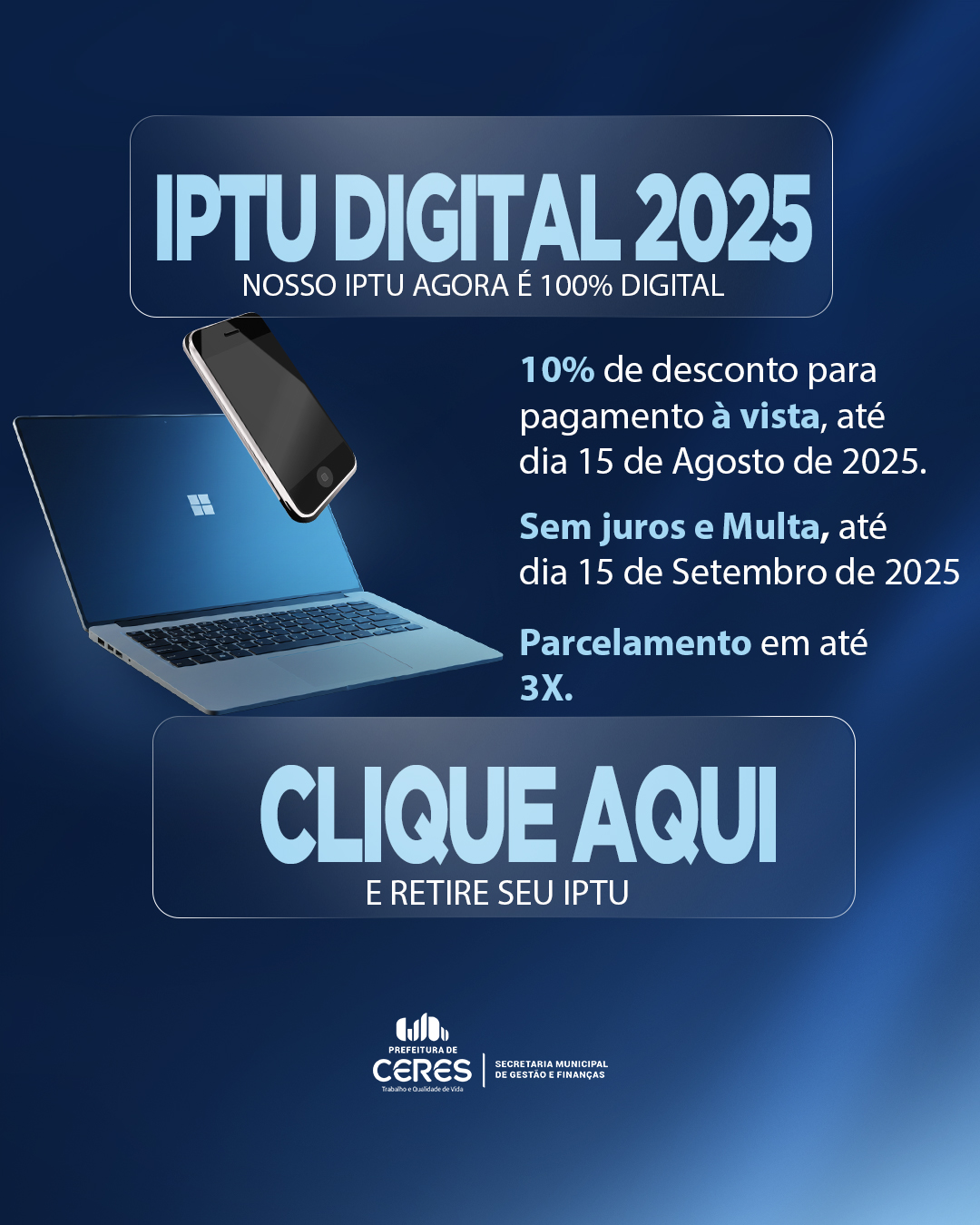 A Prefeitura de Ceres informa que o IPTU Digital 2025 já está disponível!