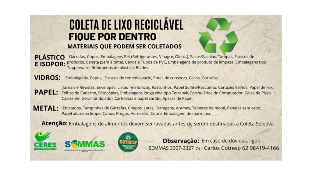 A Prefeitura de Ceres fará a coleta seletiva em todos os bairros. Atenção ao horário de coleta, você que é morador dos setores Sara Ribeiro, Conjunto Bernardo Sayão, Vila Lions e Jardim Ribeiro, fiquem atentos, pois o caminhão da coleta seletiva estará passando toda quarta-feira das 13h ás 17h. Faça A sua parte e ajude o meio ambiente.