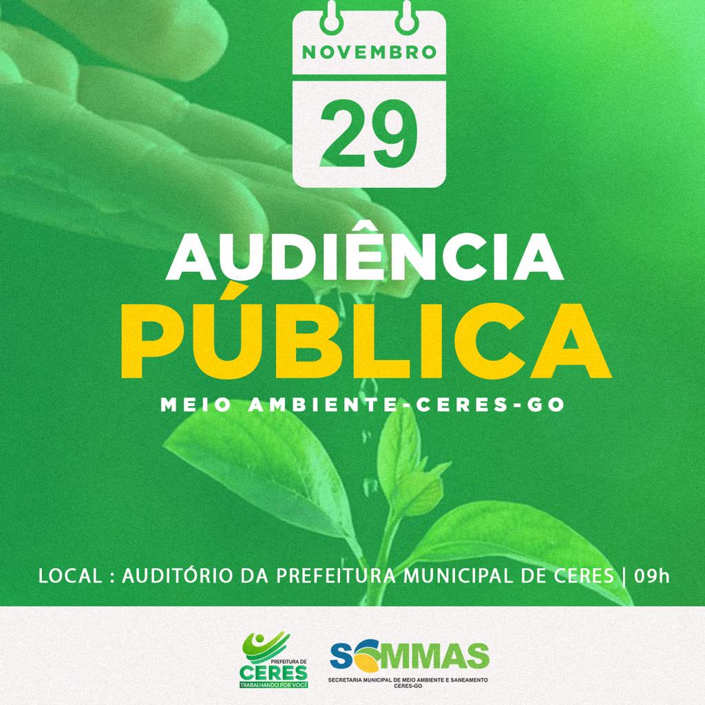 A Prefeitura de Ceres por meio da Secretaria Municipal de Meio Ambiente e Saneamento, vem convidar a população de Ceres – GO para participar de uma audiência pública para discutir a proposta de criação de uma Unidade de Conservação, a ser realizada no dia 29/11/2023 às 09h da manhã no Auditório da Prefeitura de Ceres localizada na Praça Cívica s/n Centro Ceres-GO.