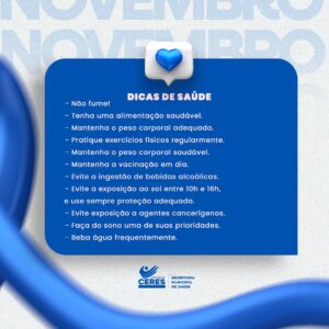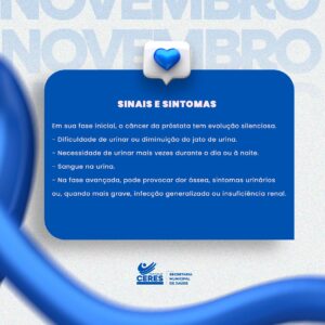 O “Novembro Azul” é o mês de conscientização sobre a saúde do homem, cujo o objetivo é alertar para a importância do diagnóstico precoce do câncer de próstata, o mais frequente entre os homens brasileiros depois do câncer de pele.
