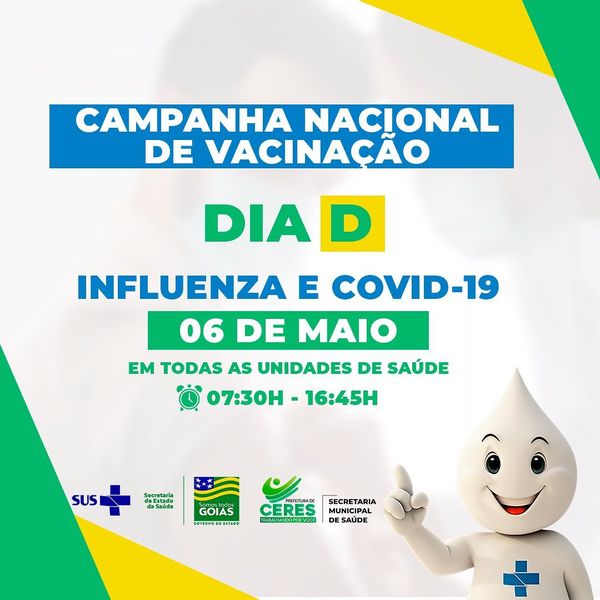 Neste próximo sábado dia 06 de maio, em todas as unidades de saúde da família de Ceres acontece o Dia D da Campanha Nacional de Vacinação contra a Influenza e Covid-19.