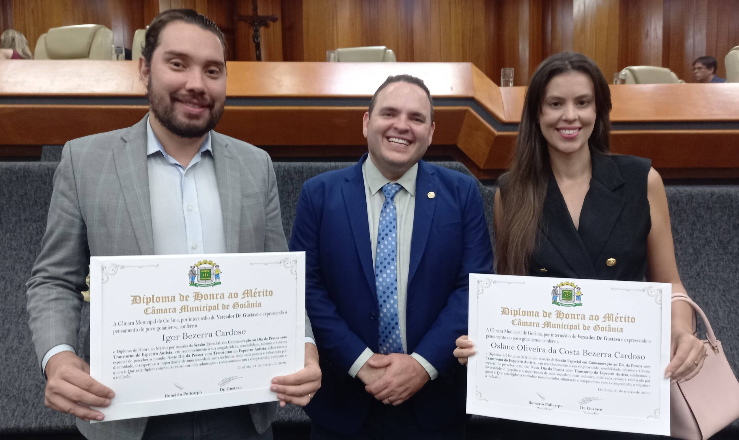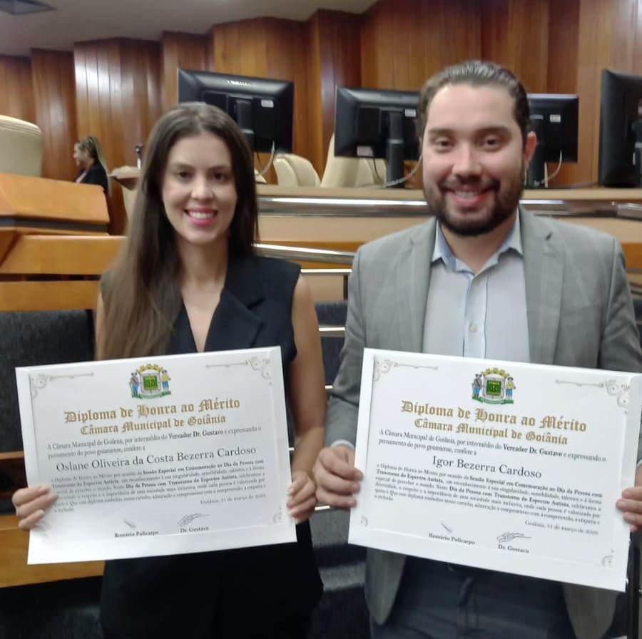 A diretoria do Instituto Goiano de Pediatria (IGOPE) foi homenageada na Câmara Municipal de Goiânia, no último dia 31, em reconhecimento aos relevantes serviços prestados à sociedade, especialmente no atendimento e acolhimento de pessoas com Transtorno do Espectro Autista (TEA). O diretor-geral, Igor Bezerra, e a vice-diretora, Oslane Bezerra, receberam o diploma de honra ao mérito por iniciativa do vereador Dr. Gustavo Gomides, em alusão ao Dia Mundial de Conscientização do Autismo, celebrado em 2 de abril.