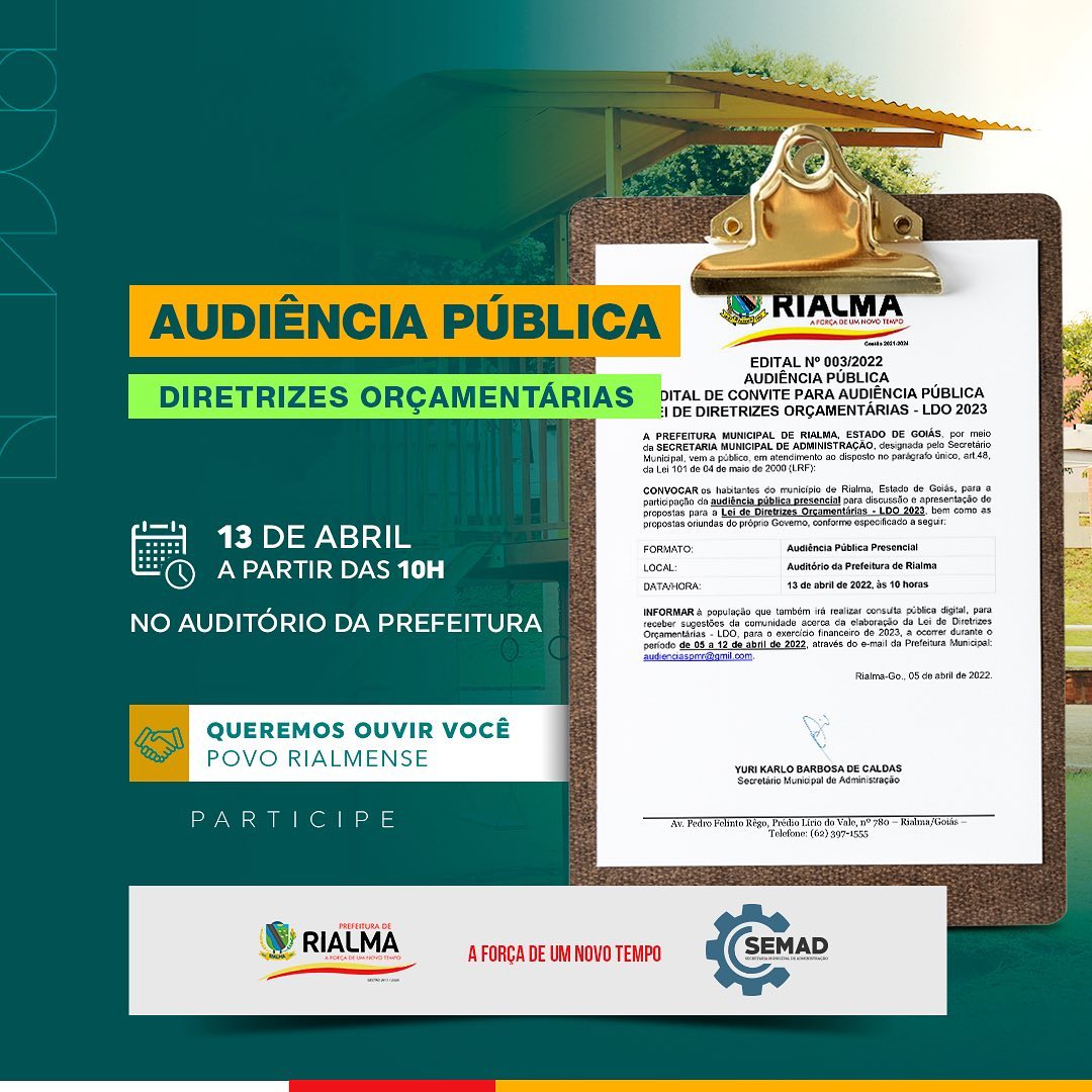 A Prefeitura Municipal de Rialma, Estado de Goiás, por meio da Secretaria de Eduacação, designada pelo Secretário Municipal, vem a público, em atendimento ao disposto no parágrafo único, art.48, da Lei 101 de 04 de maio de 2000 (LRF): CONVOCAR os habitantes do município de Rialma, Estado de Goiás, para a participação da audiência pública presencial para discussão e apresentação de propostas para a Lei de Diretrizes Orçamentárias – LDO 2023.