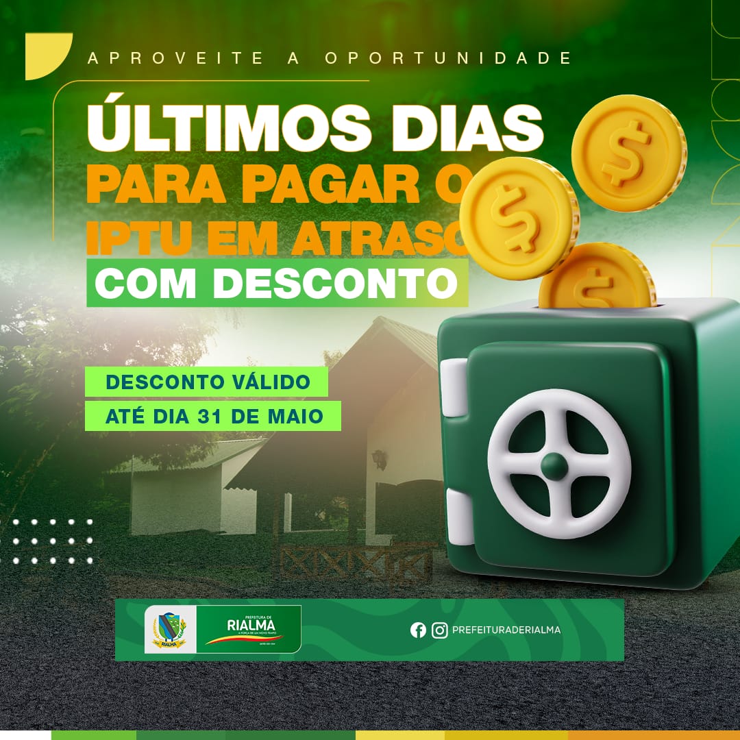 A Prefeitura de Rialma, por meio da Secretaria Municipal de Administração, informa que o prazo para pagamento do IPTU em atraso se encerra dia 31 de maio.