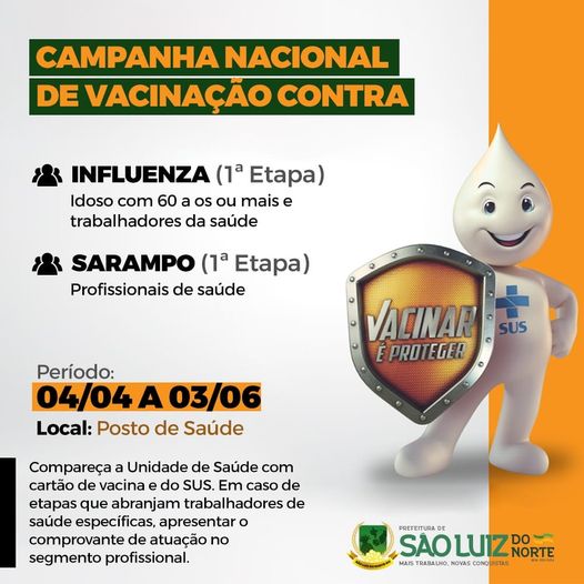 A Prefeitura de São Luiz do Norte deu início na segunda-feira 04/04 a duas campanhas de vacinação: contra a gripe (Influenza) e contra o sarampo.