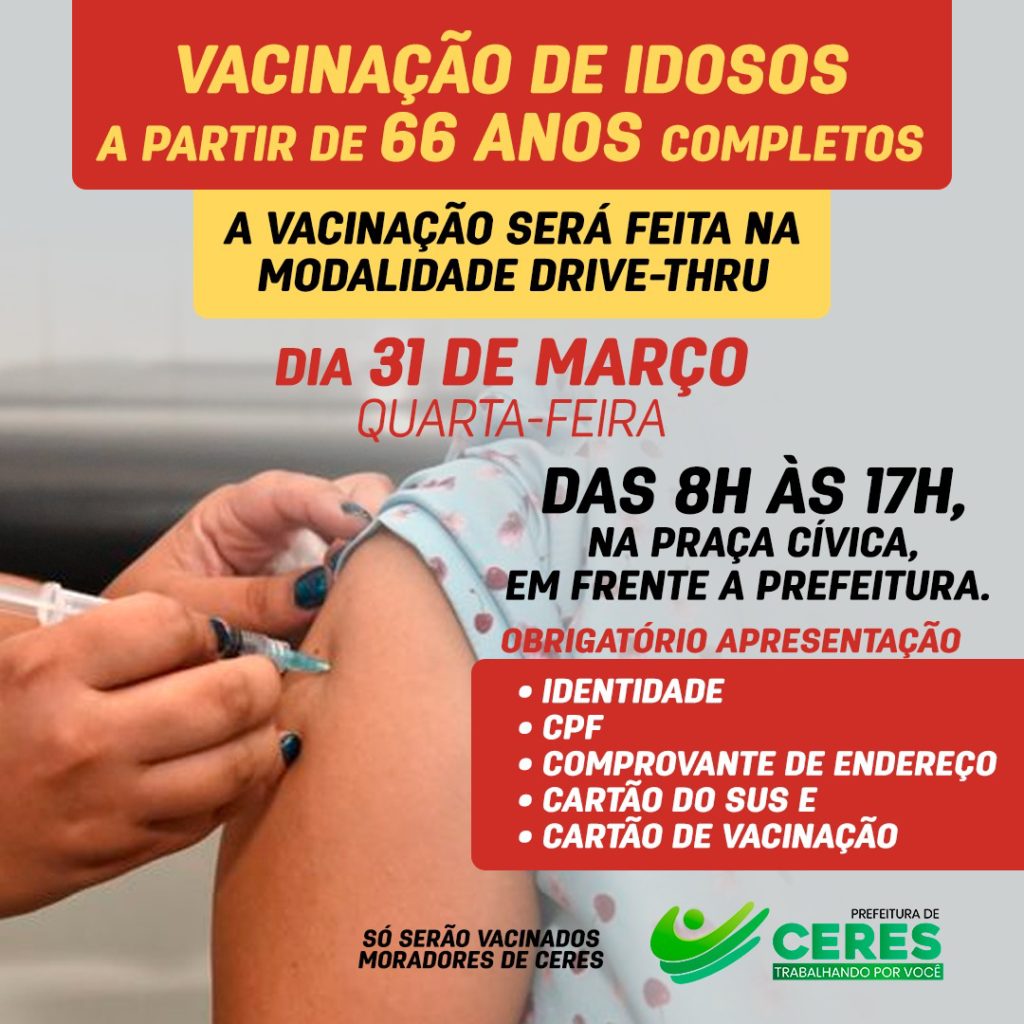A Secretaria Municipal de Saúde de Ceres iniciará a vacinação contra a Covid-19 dos idosos a partir de 66 anos, acontecerá nesta quarta-feira, 31 de março.