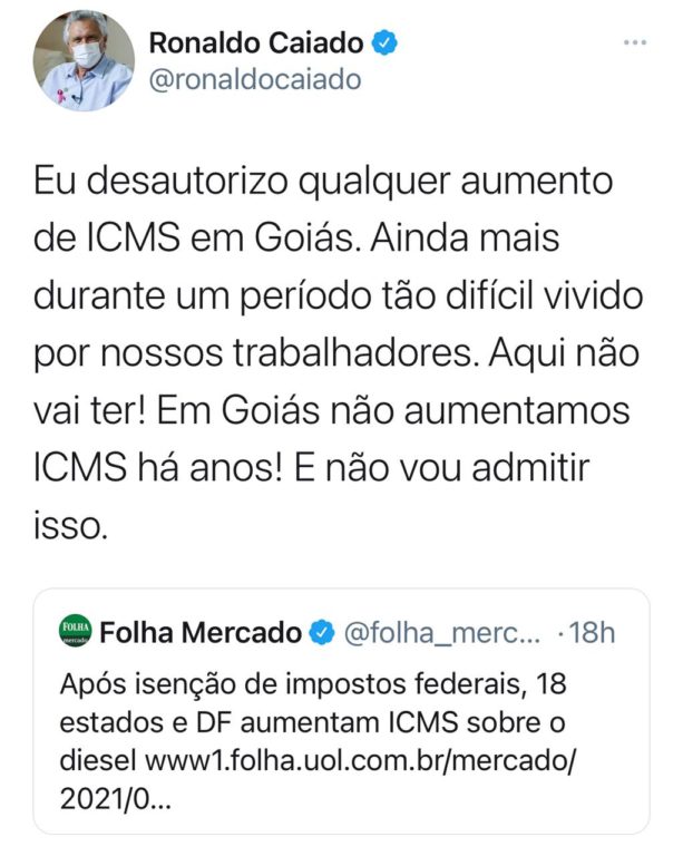 A reposta publicada no Twitter do Governador Ronaldo Caiado, deve-se à matéria do Jornal Folha de São Paulo- Após Isenção de Impostos Federais, 18 estados e DF aumentam ICMS sobre o diesel- publicada na edição desse sábado, 13/03. Caiado ainda endossa a nota emitida pelo Conselho Nacional dos Secretários de Fazenda (Consefaz)