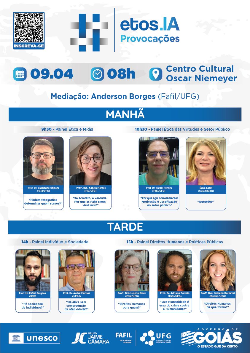 O Governo de Goiás, em parceria com a Universidade Federal de Goiás (UFG), realiza a segunda edição do Etos.IA – Provocações. Com participação de acadêmicos, docentes, representantes da sociedade civil e da comunidade, o evento tem como objetivo promover um debate sobre os limites da ética na sociedade contemporânea. A segunda edição ocorrerá no dia 9 de abril, a partir das 8h, no Centro Cultural Oscar Niemeyer. A entrada é gratuita.