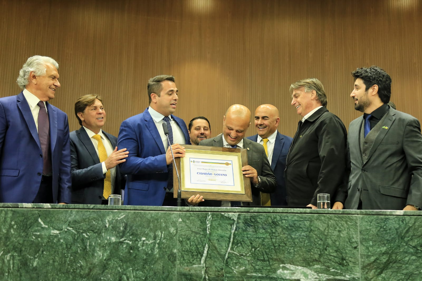 O governador lembrou que, durante seis mandatos no Congresso Nacional, compartilhou períodos com Bolsonaro, que permaneceu na Câmara de Deputados por 28 anos. “Cada um de nós sabe da responsabilidade que temos com o país”, finalizou ao citar as compatibilidades com o homenageado. Durante o evento, o ex-deputado federal Major Vitor Hugo também recebeu o título de cidadania goiana.