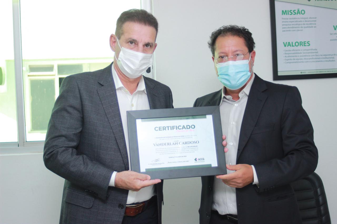 Com extenso trabalho voltado para a área da saúde e para o combate ao câncer em todo Estado de Goiás, o senador Vanderlan Cardoso (PSD-GO) foi homenageado, na manhã desta segunda-feira (18), pela Associação de Combate ao Câncer de Goiás (ACCG). O presidente da Associação, Jales Benevides, entregou uma placa intitulada “Amigos do Bem” em agradecimento pelos recursos que o senador destinou ao Hospital Araújo Jorge.