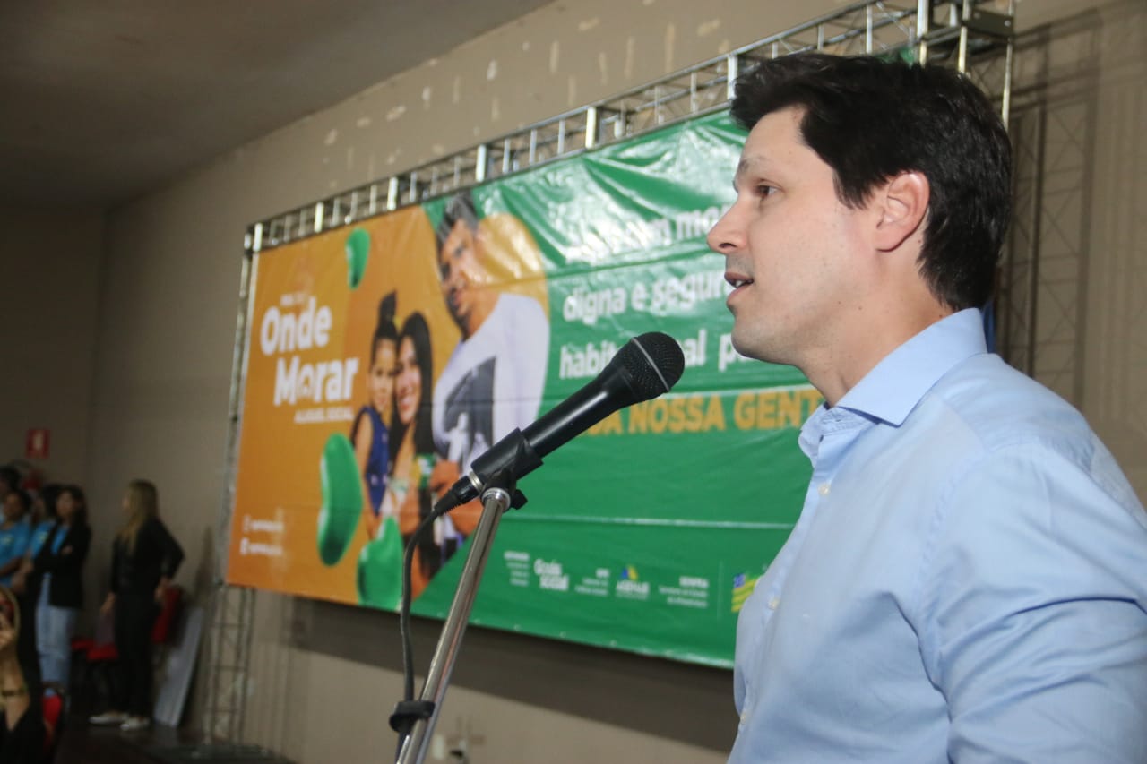 Vice-governador Daniel Vilela durante entrega de cartões do programa Pra Ter Onde Morar – Aluguel Social a famílias de baixa renda de Caldas Novas