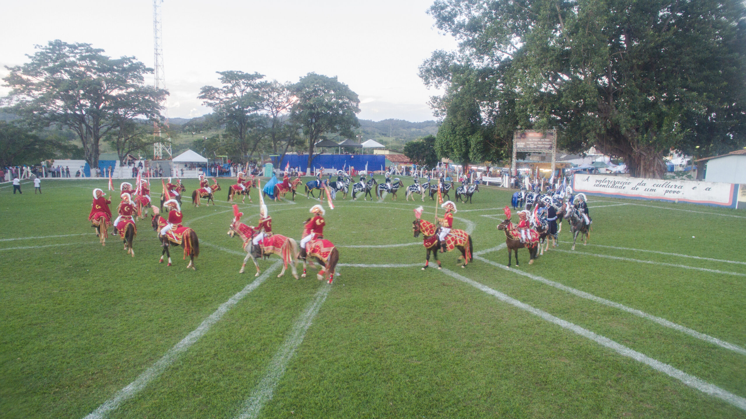 O cenário das Cavalhadas consiste em uma representação das batalhas entre cristãos e mouros na Península Ibérica ocorridas entre os séculos IX e XV. Dois exércitos, com 12 cavaleiros de cada lado, encenam uma luta coreografada e repleta de ornamentos.