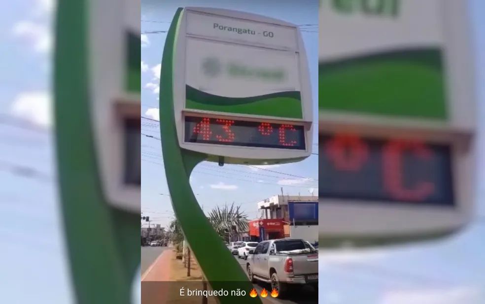 O Estado de Goiás registrou nesta semana temperaturas acima de 40ºC em vários municípios goianos. Em Porangatu, na região norte, um morador fotografou quando a cidade marcou 43ºC. O Instituto Nacional de Metereologia (Inmet) emitiu um alerta, pois a umidade do ar pode ficar abaixo de 10% durante a semana.
