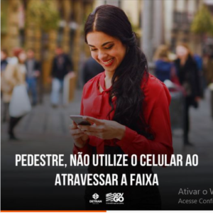 Atenção, pedestre! Ao atravessar a rua é recomendado que sua atenção esteja direcionada ao trânsito. Por isso não atravesse a faixa de pedestre olhando para o celular.