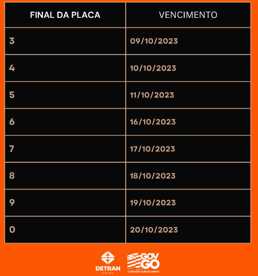 O Detran-GO lembra aos proprietários que a partir de segunda-feira (09/10) vencem os prazos para o pagamento do Licenciamento Anual 2023 de veículos com placas finais de 3 a 0. Os vencimentos são escalonados, conforme o calendário abaixo, finalizando em 20 de outubro.