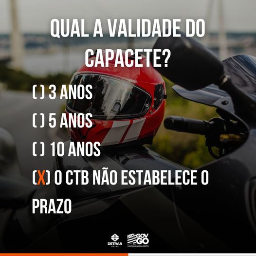 Cabe informar que a validade do capacete não é exigida pelo Código de Trânsito Brasileiro (CTB). É um produto não perecível, na etiqueta interna consta a informação com os seguintes dizeres: “Este produto é um bem durável”.