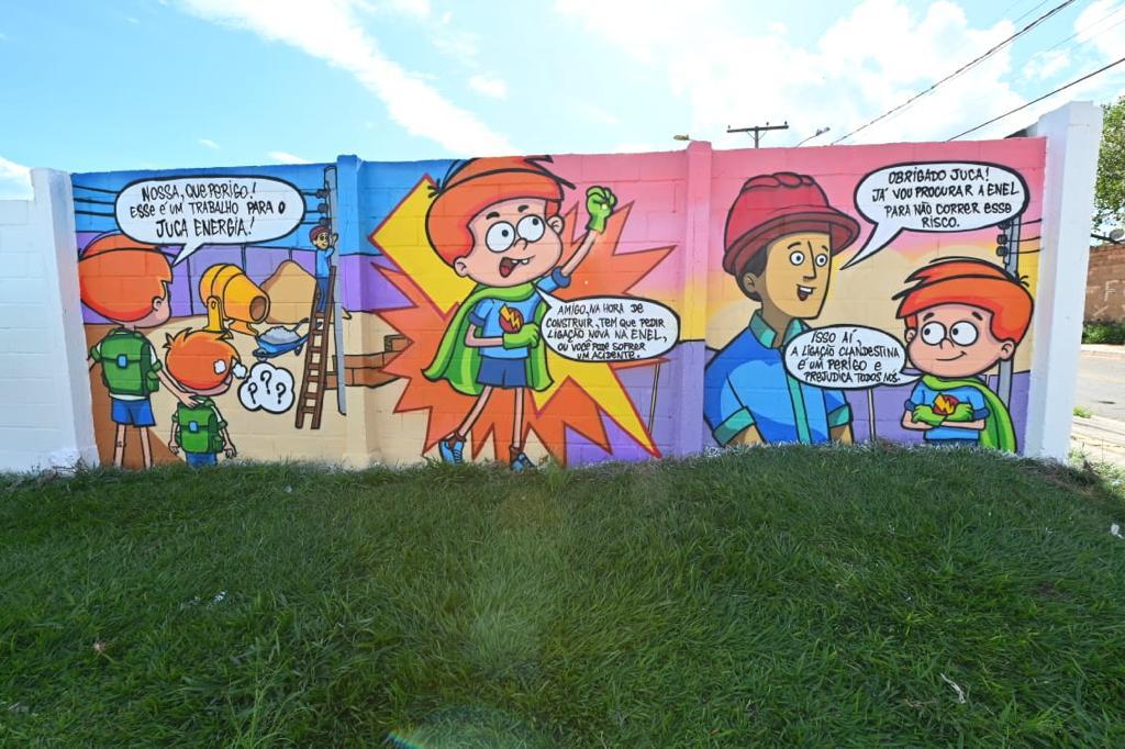 Outra ação realizada durante o Energia Legal foi o projeto Colorindo Com Energia, que consiste no grafite em muros das comunidades onde os operativos estão sendo realizados, reforçando, de forma mais lúdica, a mensagem dos riscos e malefícios do furto de energia. Nesta primeira edição, os grafiteiros escolhidos foram os artistas goianos da Grafirma, que deixaram suas artes na Escola Municipal Laurindo Sobreira do Amaral, no Conjunto Vera Cruz 2, e na Unidade Básica de Saúde do Jardim do Cerrado 4. “Agregar o Colorindo ao Energia Legal nos ajuda a levar nossa mensagem para todos os públicos, inclusive crianças e adolescentes. Usamos o Juca Energia, personagem criado para dar dicas de segurança para a população, para que ele também traga a mensagem de como é perigoso realizar uma ligação clandestina e de que forma isso pode prejudicar toda a comunidade”, explica Leonardo Pacheco.