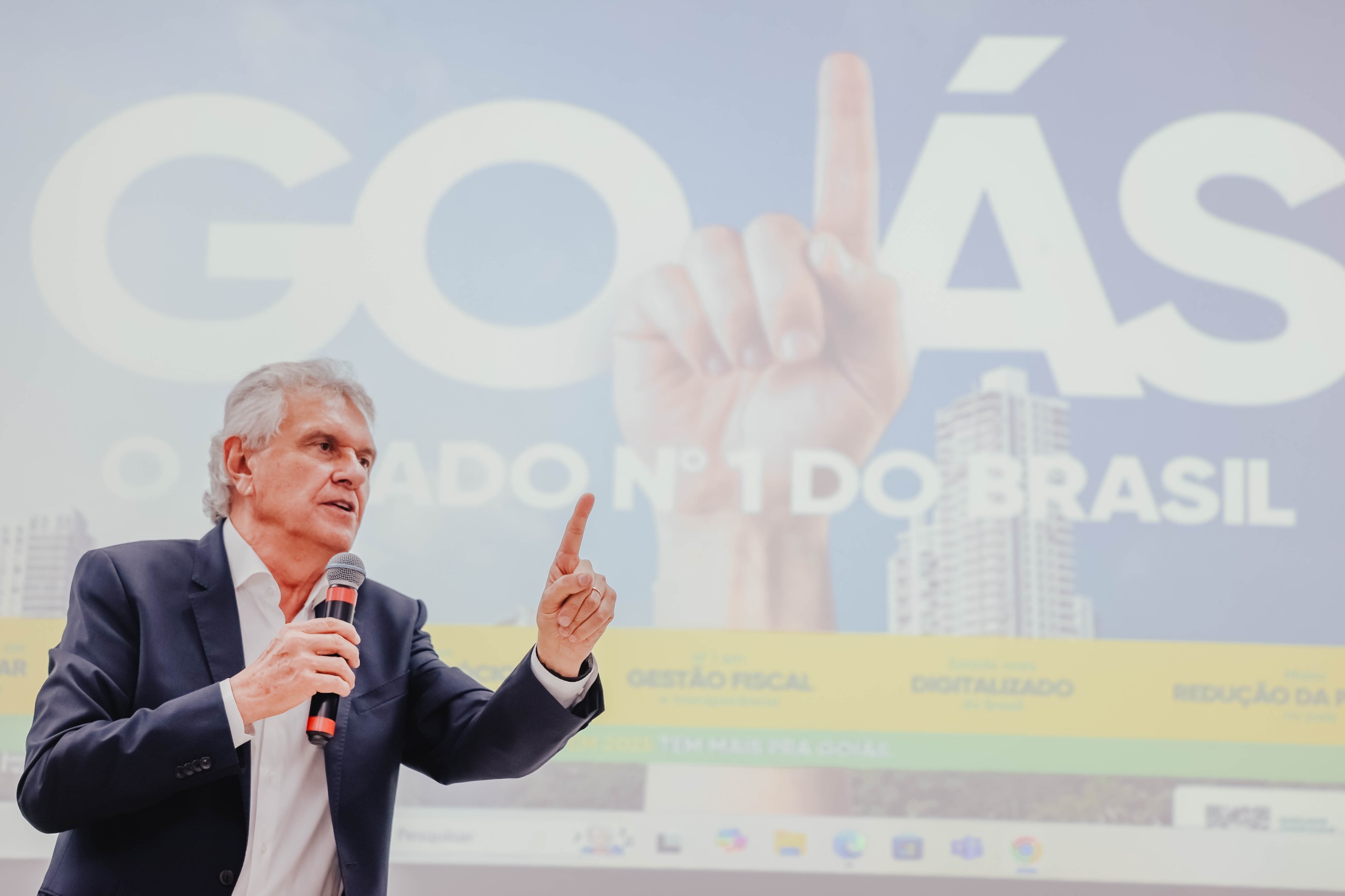 Governador Ronaldo Caiado durante entrega de 40 títulos definitivos de domínio de terras e dez caminhões destinados ao apoio à agricultura familiar e à execução do PAA Goiás