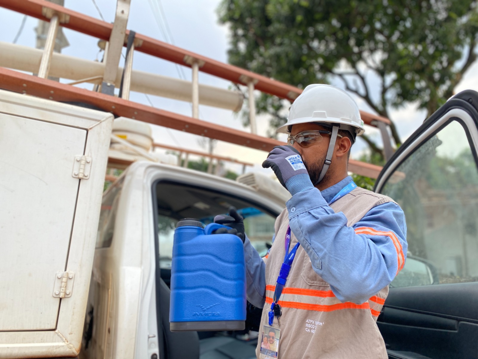 A preocupação vai desde a hidratação até a proteção adequada durante as atividades diárias. Na prática, cada veículo da distribuidora conta com galões de 5 litros de água potável. Já os uniformes, que integram os Equipamentos de Proteção Individual (EPIs), são confeccionados em tecido de algodão com proteção UVA e UVB. Além de cobrirem todo o corpo para evitar exposição excessiva ao sol, eles são projetados para oferecer resistência e segurança contra possíveis choques elétricos, atendendo às normas regulamentadoras. Mesmo com temperaturas que podem passar dos 40 °C, a concessionária prioriza tecidos que asseguram maior conforto térmico para os colaboradores.