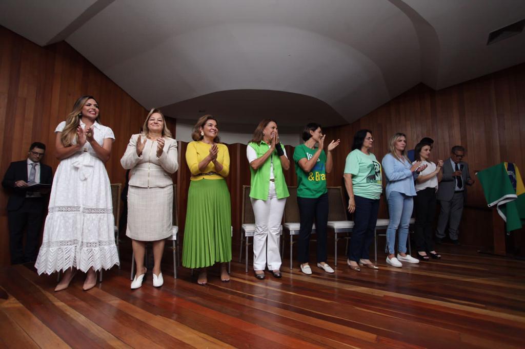 Primeira-dama do Brasil Michelle Bolsonaro, primeira-dama do Estado de Goiás Gracinha Caiado e demais lideranças femininas  de Goiás, durante o lançamento nacional do movimento “Mulheres com Bolsonaro”, em Goiânia. Fotos: Divulgação/Assessoria Senador Vanderlan Cardoso