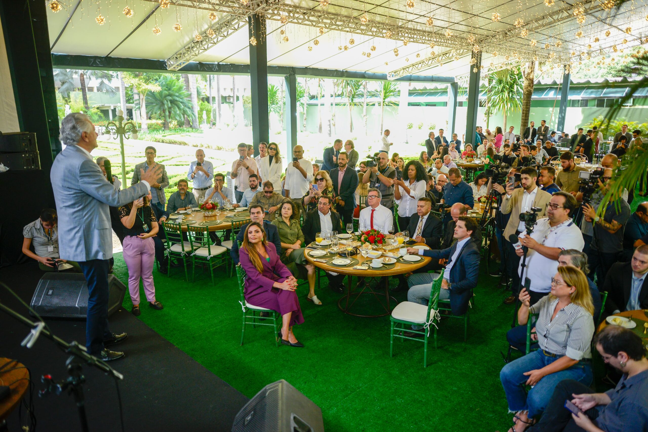 Governador Ronaldo Caiado com executivos, gestores, jornalistas e radialistas de veículos da capital: “Responder com resultados ao que a população espera”. Fotos: Cristiano Borges, Lucas Diener e Rômulo Carvalho
